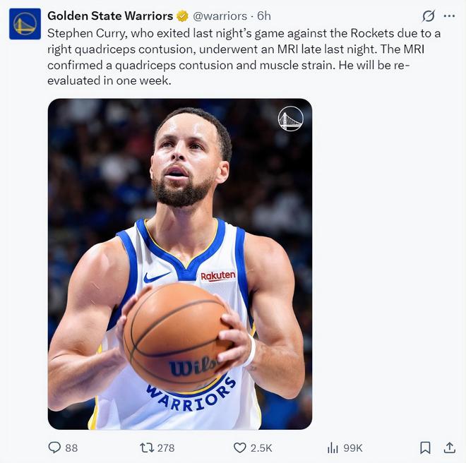 北京时间11月28日,勇士官方宣布斯蒂芬-库里因为股四头肌挫伤将缺席一周或更长时间,根据核磁共振的检查库里排除了严重伤病的风险。
