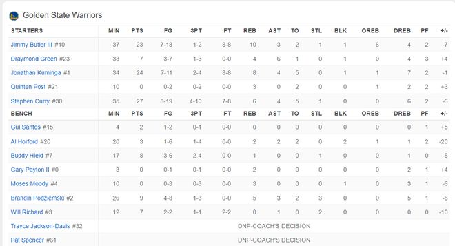 但他这个说法很明显是站不住脚的,这完完全全是一种偏袒,10月31日勇士对阵雄鹿,库明加、霍福德、小佩顿、库里都在,勇士全阵容却以10分之差惨败没有扬尼斯的雄鹿。
