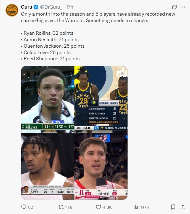 勇媒Guru也晒出新赛季开打1个月,已经有7位球员在打勇士时拿到生涯单场新高得分: