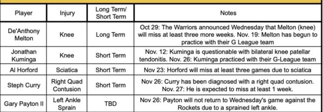 ESPN专家鲍比-马克斯发布勇士队本赛季受伤的情况,梅尔顿、库明加、霍福德、库里、小佩顿连番伤病,这导致金州勇士队在短短一个月的时间内使用了八套不同的先发阵容,他直言是伤病毁了勇士这个开赛阶段。