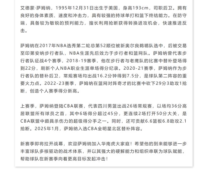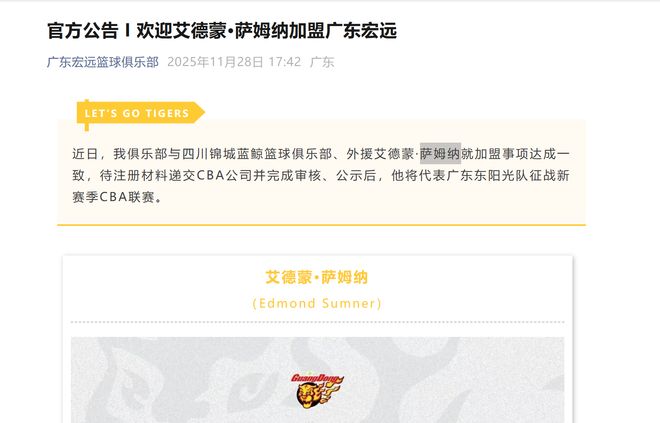 广东队官宣:萨姆纳加盟 球迷:第12冠要来了