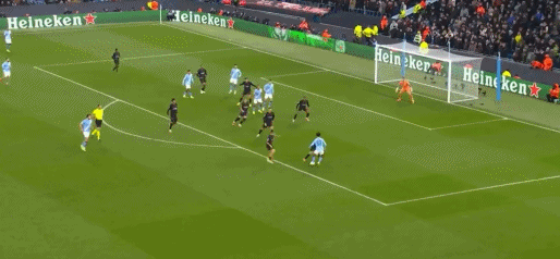 第6分钟,曼城角球造成混乱,阿克近距离射门被门将扑出